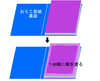 見返しの外回り1pくらいの幅に糊を塗ります。再び表紙を伏せて押さえます。