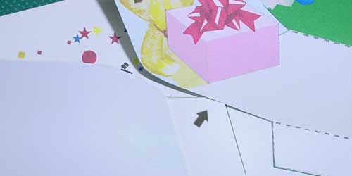 パーツの裏面の本文の貼り位置に当たる部分だけに糊を付け、平らな状態で貼ります。