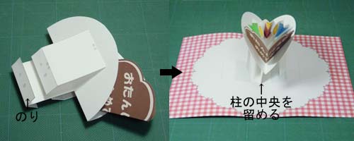 両側の柱と天板、両側の柱と台紙がしっかり留まってないとロウソクがきれいに開きません。